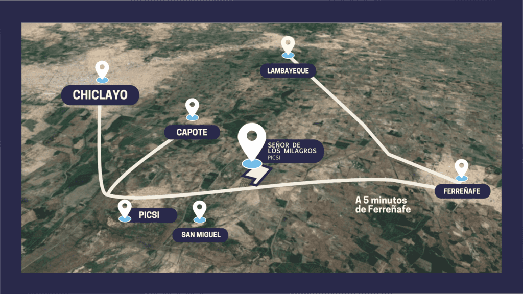 Bienvenido al Proyecto Señor de los Milagros! Ubicado en el encantador Distrito de Picsi, provincia de Chiclayo, a tan solo 15 minutos del centro de Chiclayo. Descubre lotes de 90 hasta 190 m2 con un diseño ecosostenible que combina comodidad y respeto por el medio ambiente.